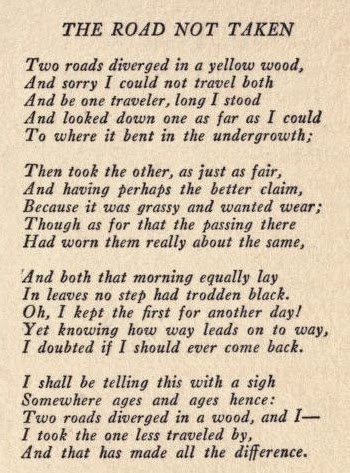 "Two roads diverged in a wood, and I- I took the one less traveled by, And that has made all the difference." Robert Frost